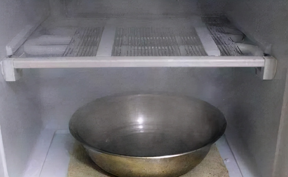 然后将准备好的干毛巾铺在冰箱的最底层,在毛巾上面放上准备好的容器,注意所选择的容器一定要足够耐热,然后将刚刚烧开的热水倒入容器当中,关闭冰箱门,静置15分钟左右。